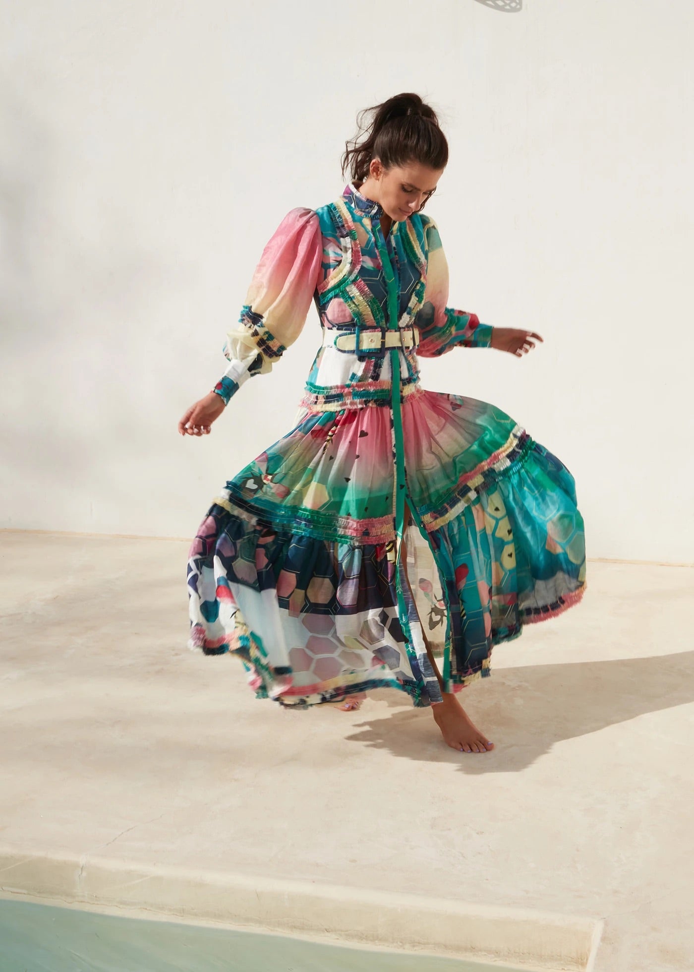 Dripping in decadence, the Queen Bee Maxi Dress with shirring ruffle detail is fabricated from fine silk printed with hues of emerald and oozes happiness. Designed to flatter the feminine form in all shapes and sizes, the adjustable belt cinches at the waist to create that perfect hourglass.