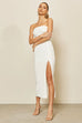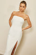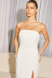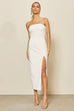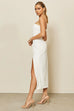 Our Bewitched Midi Dress is sleeveless with a midi length, a folded neckline, high side leg split, silicone gel around the bust, a centre-back invisible zipper. This garment has lining and slight stretch in the fabric.