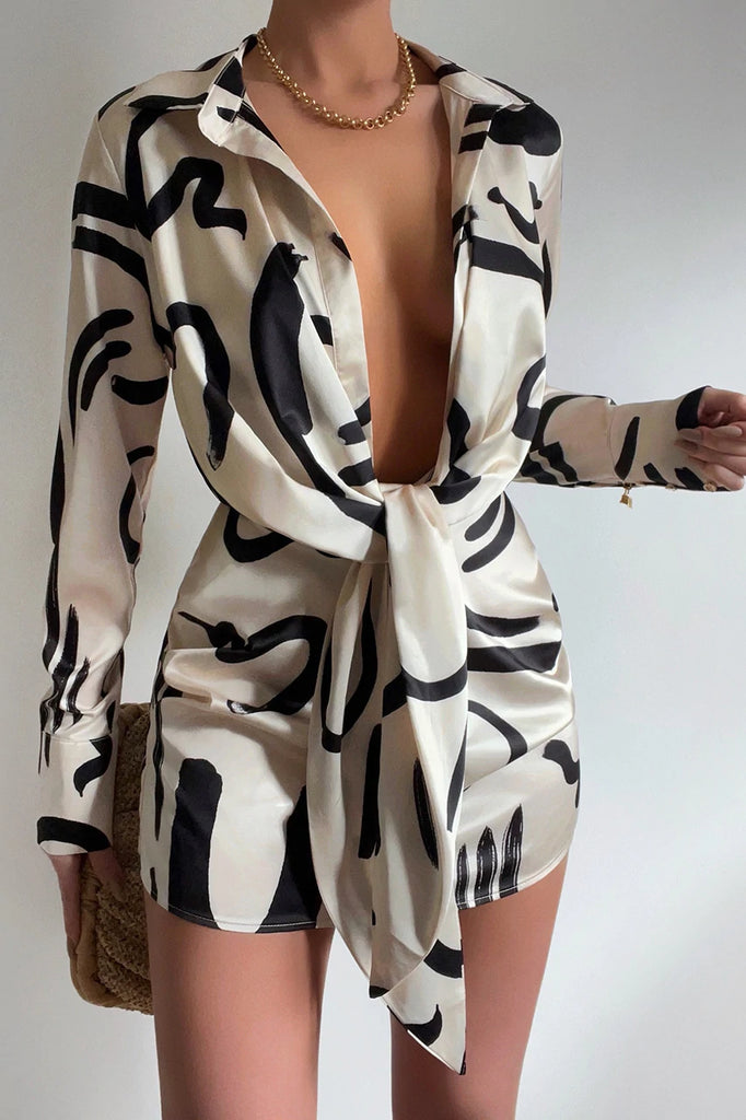 Our Ruby Dress features a mini length, centre-front buttons, long sleeves and self-ties around the waist. Lining only on the bust area and no stretch throughout the garment. 95% Polyester 5% Spandex.