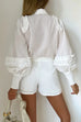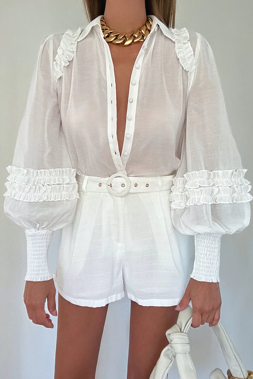 Our Bettina Shirt is a button-up shirt with collar, frills along the shoulder and arm, centre-front button opening, a long puff sleeve and cuff with button.